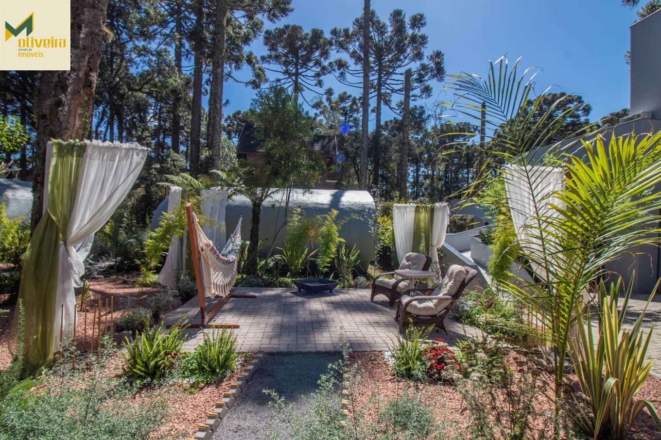 A construção principal, tem 580m², com sala de estar, cozinha, garagem, lavanderia, terraços, sauna e suítes.